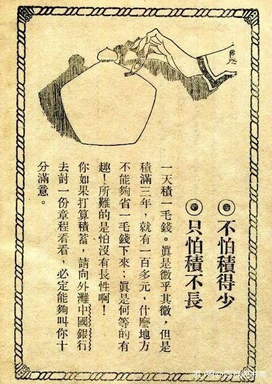 还有一张中国银行广告,告之储蓄应坚持长久,积少成多的道理。“不怕积得少 只怕积不长”。“你如果打算积蓄,请向外滩中国银行去讨一份章程看看,必定能够叫你十分满意。”