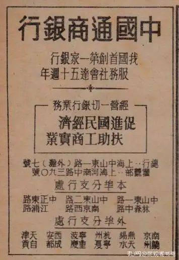 中国历史上第一家银行,可以追溯到1897年,盛宣怀创办的商办银行——中国通商银行。这是一张1947年中国通商银行的广告:“我国首创第一家银行,服务社会达50周年”。