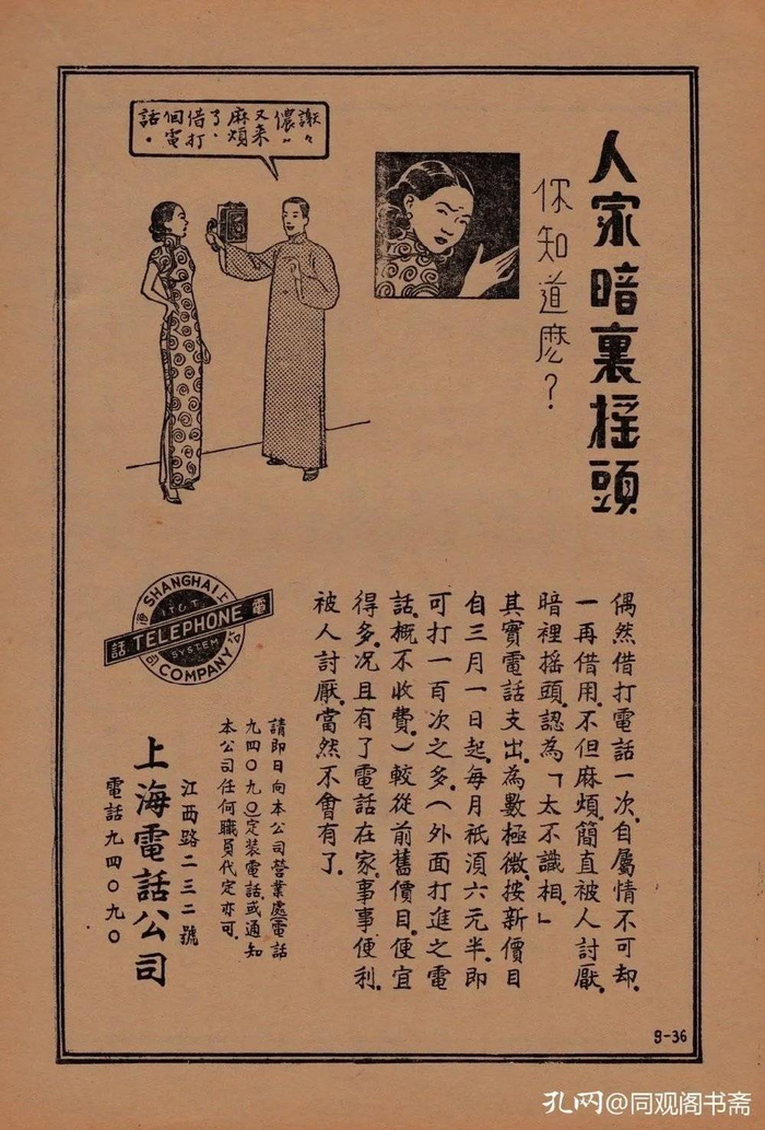 “偶然借打电话一次,自属情不可却,一再借用不但麻烦,简直被人讨厌,暗里摇头认为“太不识相”,其实电话支出为数极微,按新价目自三月一日起每月只需六元半即可打一百次之多(外面打进之电话概不收费),较从前旧日便宜得多,况且有了电话在家事事便利,被人讨厌当然不会有了。”