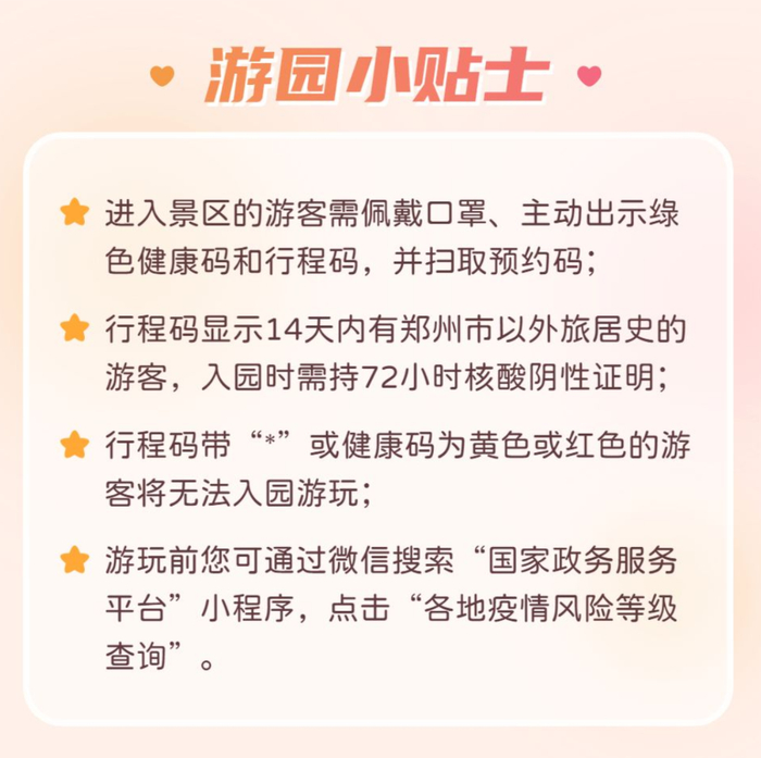 2、景区日接待量不超过最大承载量的75%。不接待中高风险地区及所在县、区旅居史的游客,14日内有郑州地区以外旅居史及郑州地区以外的游客,进入景区时需提供48小时内核酸检测阴性证明。