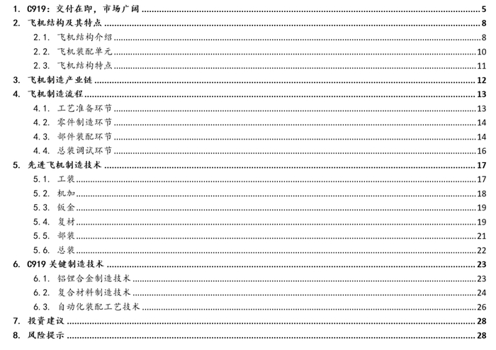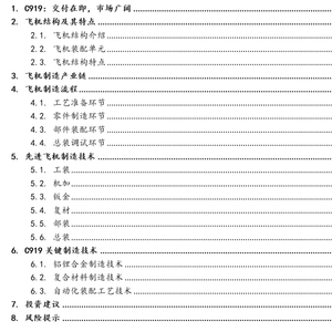 2022年5月14日,编号为B-001J的C919大飞机从浦东机场第4跑道起飞,于9时54分安全降落,C919大飞机首次飞行试验圆满完成。这意味着,国产大飞机C919即将实现交付,进入商业化运营阶段。我们将围绕国产大飞机的机体结构与制造流程、应用材料、机载设备、航空发动机和市场空间等问题发布系列研究报告。本篇报告重点探讨大飞机的机体结构和制造流程。