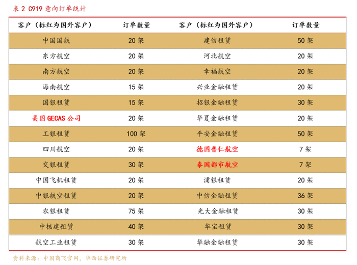 C919具有后发优势,在整体设计上采用先进的技术更多,绝大部分性能指标与波音737、空客A320持平,且价格更为实惠(C919报价0.99亿美元,后两者报价均在1亿美元以上),性价比更高。据中国商飞官网统计,C919的国内外客户达到28家,订单总数达到815架。可以认为,C919已逐步开始对波音、空客单通道飞机的替代过程。预计随着首批C919顺利交付,国航和南航等国内航空公司也将陆续引进C919。