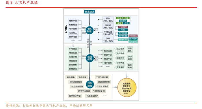 飞机制造产业链条长、涵盖范围广、带动效应强,是衡量一个国家国防实力和工业水平的重要标志。产业链上游为结构钢、轻金属材料、复合材料等材料供应商,中游为机身、机翼、尾翼、发动机、起落架、机载设备等部件制造商,下游为整机集成商。根据《打造并拓展中国大飞机产业链》,机体、发动机、机载设备及其他部分占整架飞机的价值量分别为30%-35%、20%-25%、25%-30%、10%-15%。