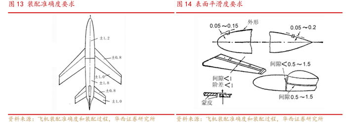 精度高:飞机的飞行寿命一般在9万小时左右,机身之间的装配精密程度对飞机的使用寿命有较大影响。比如,C919各机身段与段之间空隙距离的精度达到0.03-0.05毫米。此外,若蒙皮与贴合的骨架之间有较大的装配间隙,就会发生很大的装配应力,会导致飞机强度和寿命的降低。