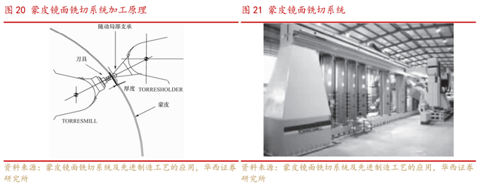 代替化铣的蒙皮镜面铣切系统:该系统是一种镜像对称、双头随动、连续加工薄蒙皮和双曲蒙皮的专业蒙皮加工设备,可以取代蒙皮拉形后的手工修整作业和钣金蒙皮的化学铣切。