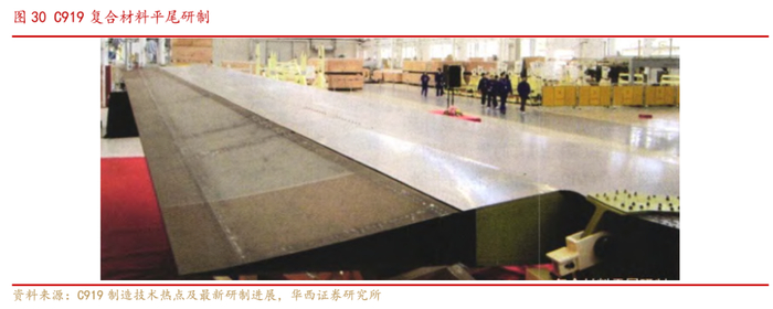 C919在平尾、垂尾、后机身、后压力球面框等结构上使用了复合材料。此前,复合材料制造技术在国内虽已有一定的应用基础,但尚未在民用飞机的主承力构建中使用,未形成稳定的、满足适航验证要求的制造工艺。C919项目针对这一短板,通过复材构件制造、检测、装配这一主线过程,梳理制造关键技术,分别攻关,形成了民用飞机复合材料承力构件研制能力。