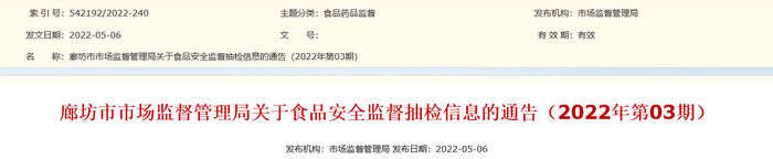 中国质量新闻网讯 近日,河北省廊坊市市场监督管理局发布关于食品安全监督抽检信息的通告(2022年第03期)。据通告,近期,廊坊市市场监管部门抽检22类食品。其中,抽检食用油、油脂及其制品20批次,未检出不合格样品。