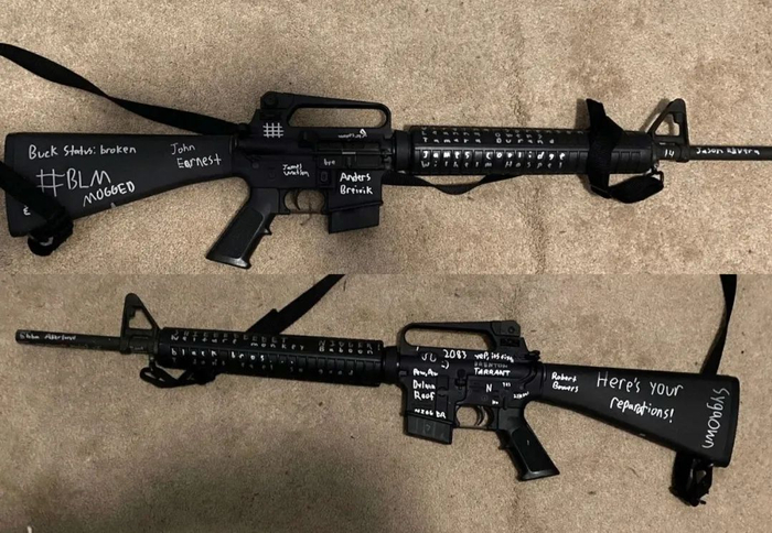 在三把枪支上,根德隆用白色油漆写满了种族主义口号。突击步枪的枪托上,一面写着 “这就是你(黑人)要的(奴隶制)赔偿金”,另一面则写着“踩烂‘黑人的命也是命’(美国黑人民权运动名字-笔者注)”。