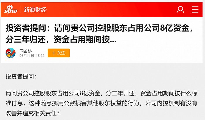 这种“拆西墙补东墙”的做法背后则是公司内控制度的严重缺失。有投资者在5月11日表示,这种随意挪用公款损害其他股东权益的行为,公司内控机制有没有改善并追究相关责任?