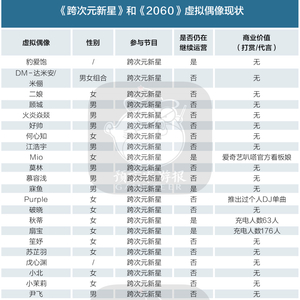值得一提的是,去年的行业整顿之后,选秀这一综艺节目的重要品类直接消失。虚拟偶像似乎可以直接填补相关的市场空白,再次激起沉睡的追星热情。