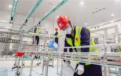 日前,记者走进伊利现代智慧健康谷液态奶全球智造标杆基地项目施工现场,所到之处一派热火朝天的建设景象。大型机械轰鸣、工人来回穿梭、设备安装调试……在这里,近两千名工人正在紧张有序地施工。记者看到,该项目主体结构的土建已经全部完成,设备安装已完成90%,设备调试和室内工程装修紧锣密鼓进行,预计6月份投入运行。云艳芳 摄
