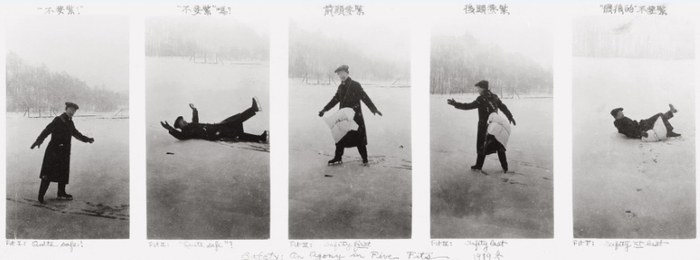 摄影爱好者赵元任还会自拍下自己玩耍的样子。这是在大学附近的毕比湖上学滑冰,为了表现自己是如何自我保护的,他用照片记录了“滑冰防护”五部曲:1、“不要紧!”2、“不要紧”吗?3、前头要紧;4、后头要紧;5、“最后的”不要紧。(1919年冬)