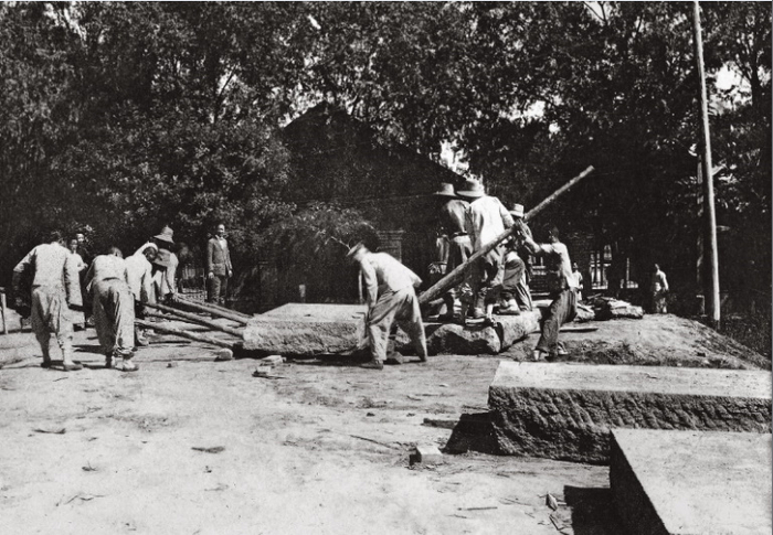 当时清华园内大兴土木,下图中,物理老师赵元任正观察工人搬运大石块(1920年)。