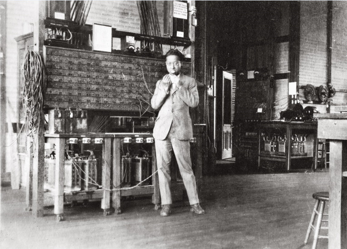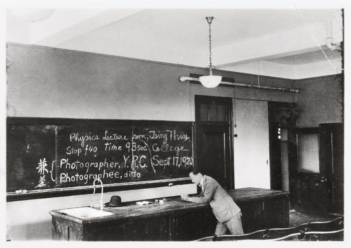 1920年,赵元任回国到清华任教。由于前一学期学生罢课,赵元任到清华后,主要补教“中学代数”和“口述英语作业”两门课程。补课完成后再开设心理学,并与梅贻琦合开物理课。下面这张照片中,赵元任在课堂黑板上写下:“物理课讲授, 清华学校,1920年9月17日。兼差:摄影师,赵元任;被摄者,同一人”。