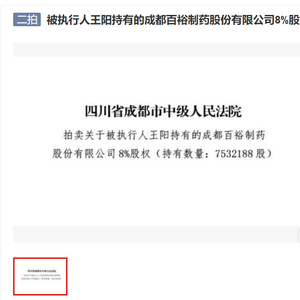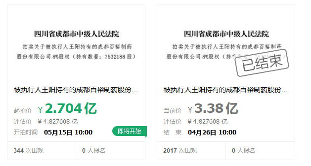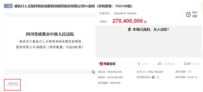 中国经济网5月17日讯(记者 朱国旺)5月16日,在淘宝网司法拍卖网络平台上,四川省成都市中级人民法院拍卖被执行人、成都百裕制药股份有限公司王阳持有的8%公司股权,无人出价,再次流拍。此前的4月26日,王阳持有的这一股权以4.83亿元的评估价、3.38亿元的起拍价拍卖,最终以流拍告终。此次降价20%,以2.704亿元拍卖,仍无人接手。在公司冲刺IPO之时,股权接连流拍难免不引起市场关注。