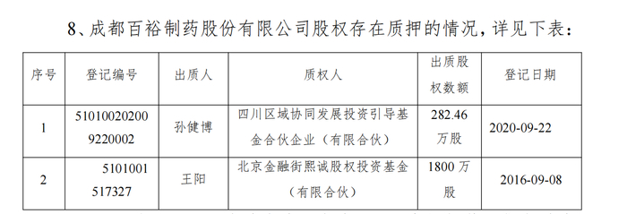 2016年9月8日,王阳将其持有的百裕制药1800万股向熙诚基金(有限合伙)进行了质押登记。