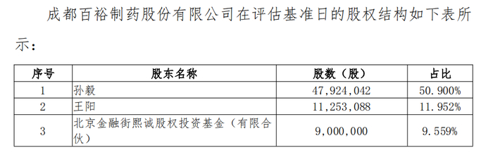 据了解,经过历次股权变更、增资后,成都百裕制药股份有限公司在评估基准日(2021年6月30 日)的股权结构为孙毅持股47,924,042,占50.900%;王阳持股11,253,088,占 11.952%;熙诚基金持股9,000,000,占9.559%,排在孙毅、王阳之后,跻身为第三大股东。