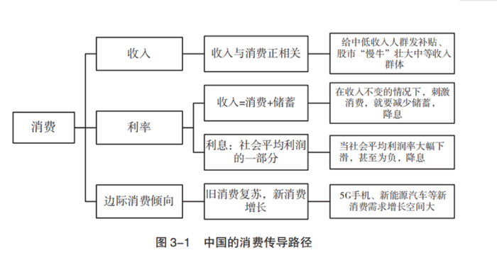 消费不完全是经济内生变量,而是与投资一样,是可以通过政策手段和经济杠杆来影响的。从传导机制上看,促进消费复苏的办法有很多,可以从增加居民收入、推动地方政府考核机制转变、降低居民储蓄率、推动股市“慢牛”“长牛”、稳定老消费、刺激新消费等多方面入手(见图 3-1)。
