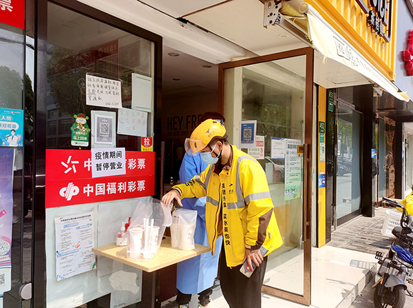5月16日,外卖小哥在店门口取奶茶。 上海金山区提供