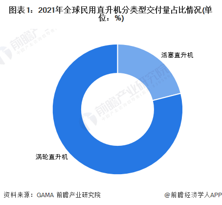 民用直升机一般可分为涡轮直升机和活塞直升机。2021年,全球涡轮直升机的交付量超过670架,占交付总量的八成左右。涡轮直升机具有功重比(发动机功率与重量之比)高、振动小、高空性能好等优点,应用范围相对较广,市场参与企业相对较多。