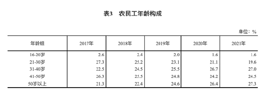 4月29日,国家统计局发布《2021年农民工监测调查报告》,数据显示,我国农民工的平均年轻持续提高至41.7岁,比上年提高0.3岁;其中,50岁以上占比超过27%。