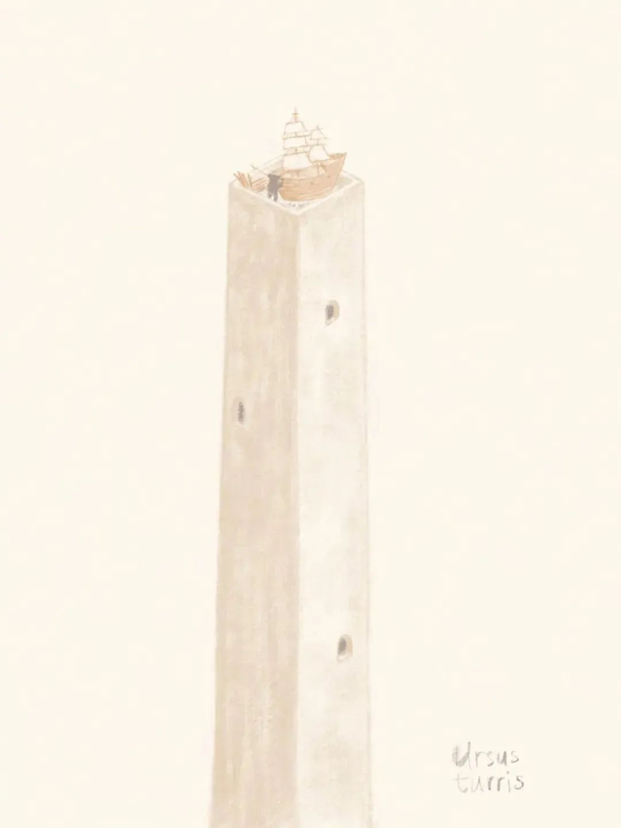 顾湘的插画则将这些小动物的故事演绎得更加生动丰富,例如塔熊在她的画笔下是一只被高耸入云的塔衬得尤其小的熊,仿佛脱离了与现实世界的一切联系,顾湘说:“天空与船是很不搭的两个东西,可见它做的是一件不切实际的事情,没想过要派上什么用场,但造船又是一件很难的事情,就像所有诗人、画家做的事情。”