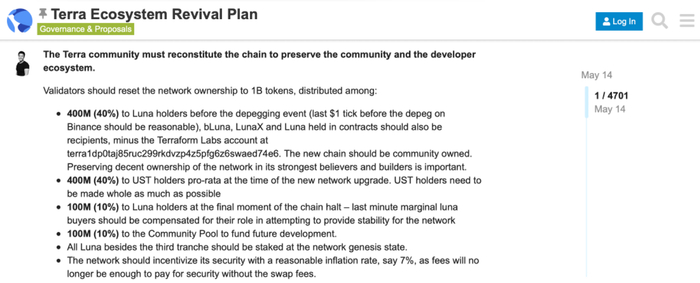 为了挽救LUNA及其稳定币UST,上周末,Terra(LUNA)创始人Do Kwon推出了“Terra生态系统的复兴计划”,其中一个提议是提供新的LUNA币。