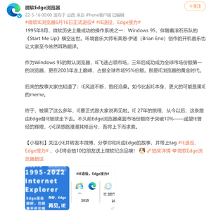 微软5月16日官方宣布,伴随一代人青春成长的IE浏览器将于6月16日正式“退役”,未来将由Edge浏览器接棒。(当然,微软仍会为Microsoft Edge的“IE 兼容模式”带来持续的改进。即使在 IE 停用后,Microsoft Edge 中的 IE 模式仍可扩展旧应用程序的使用。)