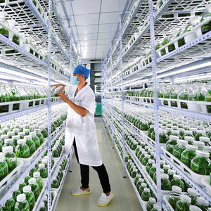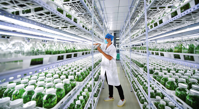 2020年4月21日,海南胜嵘生物科技有限公司石斛育种培养室内,工作人员查看石斛种苗的生长情况 郭程摄 / 本刊
