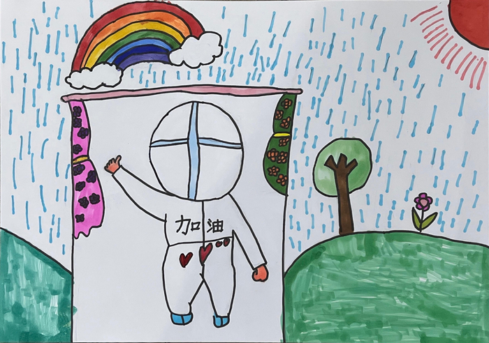 6岁的马悦蘅画了一个竖着大拇指的“大白”,他留给我们一个背影,显得很酷。外面的天空下着蒙蒙细雨,马悦蘅一笔一笔画下了春雨,但她相信我们即将迎来雨过天晴的那一刻,彩虹和阳光又将重回上海。