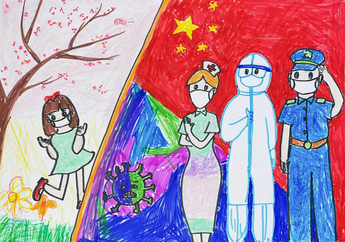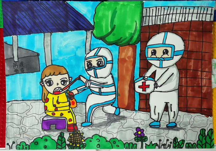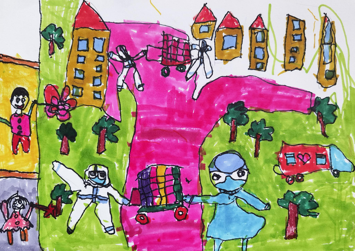 上海市徐汇区胡姬港湾幼儿园薛茜允小朋友是个好孩子,他所营造的画面和主题完全投射出当下社会主流美术教育的成果,甚至这幅画作可以成为宣传画张贴在社区的橱窗里,满满的正能量,这是一个6岁的孩子对于当前新冠疫情的所思所想的反映。值得一提的是,画面中三道明亮的黄色将背景分割开,同时也强化了视觉效果,增强了动感。