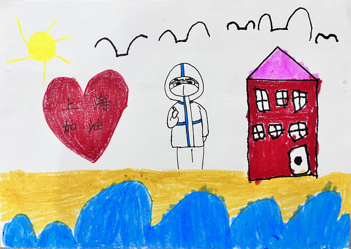 5岁的马钰涵眼里的世界由红黄蓝三原色构成,“大白”站在画面中间,他的站姿十分端正。一颗写着上海加油的红心悬在半空中,在孩子眼里,这颗心与红色的房子一样,都是她所看到的东西,都是在疫情中被大大放大了的东西。