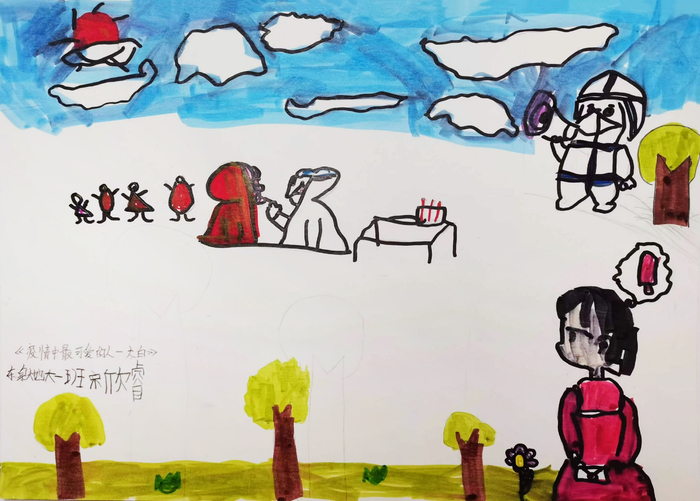 7岁的何以然已经有了不错的绘画表现力。“我要感谢‘大白’,还有小区物业的工作人员,还有快递叔叔们......”何以然说。在“大白”背上,她画上了一只小猫咪,孩子眼里的“大白”是充满爱心,喜爱小动物的,她也在画里给他们比了个心。