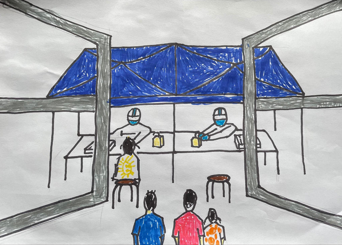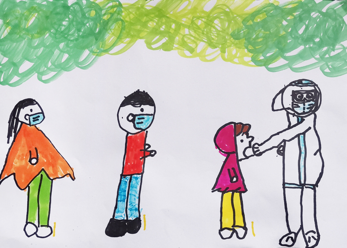崔泰熙小朋友的画面简单,寥寥数笔画下绿色树木,犹如天空下的鬈发。“大白”的脸对着观众,就像一只机器猫。他的左边,三个孩子还是他的父母一字排开,正在进行核酸检测,他们的衣服色彩鲜艳,乖乖地等着。