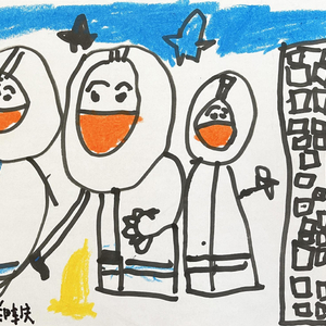 我们可以想象郑轶小朋友拿着黑色的笔,用不假思索的线条,稚嫩地勾画出“大白”,勾画出楼栋,涂上红色黄色和蓝色。理智告诉大人们,那些脸上红红的月牙应该是一个个橘红色的口罩,但它更像“大白”张得老大的嘴巴,就仿佛他透过了口罩,与小朋友逗乐玩耍,缓解他们不安的情绪。这让人我们看到小朋友心里装着的那份单纯。