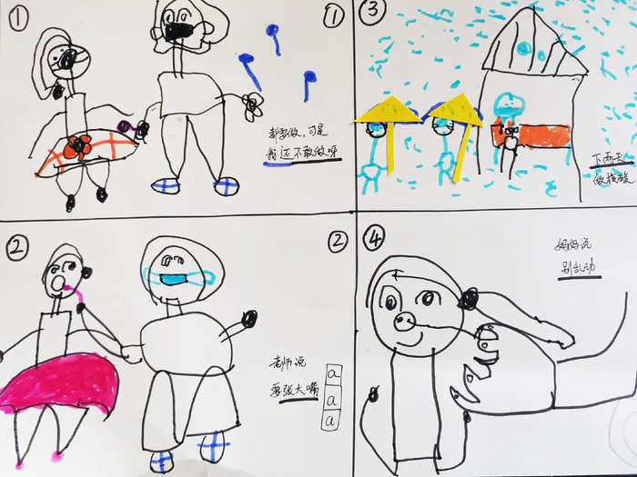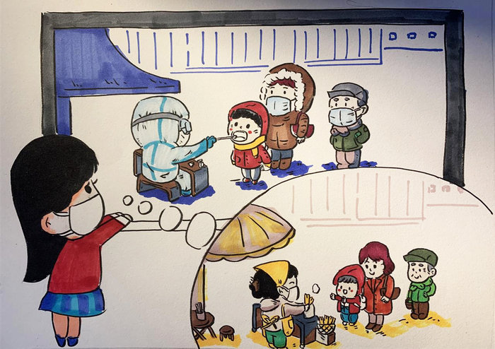7岁的庄启祎家住浙江省宁波市奉化区,4月份由于突发疫情,部分小区采取落实“三区”相应管控措施。小朋友真实感受到了疫情就在身边,也意识到了防范于未然的重要性。在一起去做核酸时,全程与大人保持一米距离并戴好口罩的情况下独立完成。庄启祎画的是她自己做核酸时的一个情况转述。她说,医生们穿着防护服一定很累很难受却还是很用心很耐心,让她很有感触,读懂了责任与担当。她说等疫情结束后,她一定要去逛逛万达商场,还要去好多好多的地方玩,希望疫情早点结束,能自由地出行。