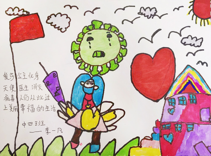 李一凡画了红旗红心和红色的太阳,主人公爱莎公主化身天使医生,挥舞着紫色的魔棒,把悬在半空中的绿色病毒打哭了。在那之后,人们过上了幸福的生活。小姑娘的世界里充满了童话的纯真,也怀有勇气和智慧。她说,长大要做医生,帮助人家。