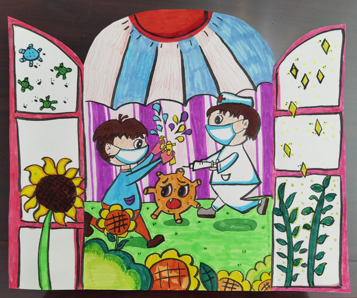 周芊羽将画面经营得有板有眼,每一处都照顾到了,甚至窗后面灰褐色的背景。画面具有很强的叙事性——新冠病毒在“大白”的脚下,正做出挣扎状,前景两侧的窗户有植物的茎叶舒展,充满生机,形成了一种内在的紧张感,这也是我们当前的生活现状。周芊羽小朋友的小脑袋里还真装了不少事。