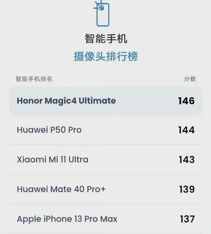 在最新的DXOMARK榜单上,前四名均是中国手机厂商:第一名是荣耀,荣耀Magic4至臻版以总分146的成绩摘得桂冠,第二、三名分别是华为 P50 Pro(144)和小米11 Ultra(143),苹果iPhone13 Pro Max排名第五。