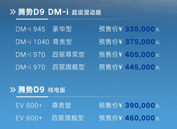 此次发布会上,腾势品牌全新战略下的首款车型——腾势D9也正式开启预售,新车推DM-i超级混动和纯电共6款车型,预售价33.5万元-46万元;另外,还推出一款创始版车型,预售价为66万元,限量发售99台。