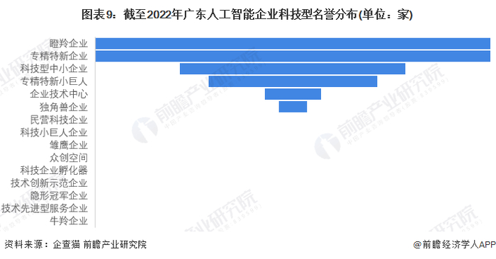 根据中国企业数据库企查猫,目前广东省存续和在业的人工智能企业共1086家,其中共有14家企业为瞪羚企业,14家企业为专精特新企业。