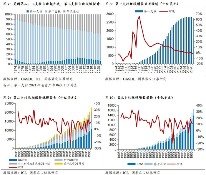 美国是典型的“三支柱”体系,第三支柱规模快速增长