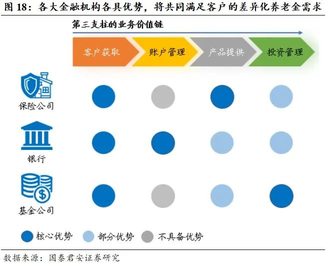 在个人养老金新政下,预计银行、证券(基金)和保险将共同参与,分享个人养老金带来的增量资产规模。我们认为,各大金融机构各具优势,将共同满足客户的差异化养老金需求,实现客户获取。其中,银行的优势主要在于账户体系,证券(基金)的优势主要在于投资能力,保险的优势主要在于产品+服务的供给。