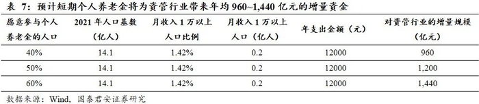 因此,我们预计短期在政策层面尚未提升税优额度的情况下,个人养老金将为资管行业带来年均1,200亿元的增量资金。我们假设在当前每月1,000元的税优政策支持之下,月收入在10,000元以上的人群有意愿通过参与个人养老金政策减少纳税基数。假设全国月收入10,000元以上人口规模2,000万人(约占总人口1.42%),其中愿意参与个人养老金的人口占比为50%,那么将带来每年1,200亿元资管行业的增量资金。