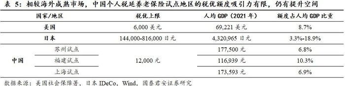 相较海外成熟市场,我国税优政策在试点地区的吸引力较为有限,税优额度仍有提升空间。从美国和日本看,2022年美国IRA存入限额占人均GDP比重为8.7%,日本iDeCo缴费限额占人均GDP比重为3.3%-18.9%,而我国试点个人税延养老保险的地区(苏州、福建和上海)的税优额度占比约6.8%~10.3%,整体上提供的税优政策对纳税人的吸引力有限。此外,我国目前适用的税率水平低于美日,相同额度所带来的节税水平也较低,适当提升税优额度占比,有利于提升个人养老保险的吸引力。在本次个人养老金新政中也有提出人力资源社会保障部、财政部根据经济社会发展水平和多层次、多支柱养老保险体系发展情况等因素适时调整缴费上限。