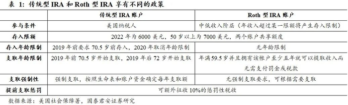 IRA享受税优政策的缴费限额正不断提升。1974 年推出IRA之初,未能得到雇主资助退休计划覆盖的雇员每年向自己的 IRA 中存入1000 美元,本金和收益免税,可在退休后支取;1981 年《经济复兴税收法案》,允许所有工作人员,不论是否拥有退休计划,建立自己的 IRA,每年可以免税存入最多可达 2000 美元的金额,同时还允许将雇主资助投资计划账户中的金额和组合转入IRA;2001年《经济增长和减税合并法案》计划将2003年度IRA的年投资金额提高至 3000美元,此后IRA的缴费限额每过几年均会有所提升,2022年50岁以下账户持有人存入限额为6000美元,50岁以上限额为7000美元。