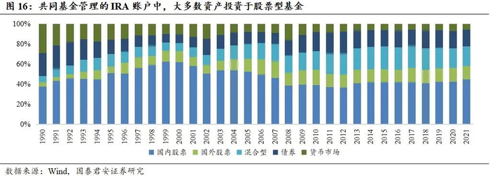 共同基金管理的IRA账户中,大多数资产投资于股票型基金。截至2021年末,共同基金管理的IRA资产中,股票型基金资产占比达58.3%,但这一比例在历史上经历了两次较为明显的下降。第一次下降发生在2000-2002年互联网泡沫时期,第二次下降发生在2008年金融危机时期,总体上共同基金的投资管理在经历风险事件后愈加审慎和理性。