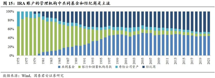 IRA账户的管理机构中共同基金和经纪商是主流。在IRA计划推广之初,银行等储蓄机构和寿险公司是管理的主流,随着美国公募基金市场的逐步兴起,共同基金和经纪商取代了银行和寿险公司成为管理IRA账户的主流机构。