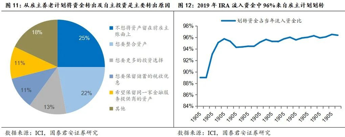 IRA采取账户制管理方式,核心优势在于养老金从雇主养老计划转入IRA以及自主选择养老金投资计划。IRA采用账户制主要两大核心优势,一是居民能够从雇主养老计划中将养老金转入IRA,极大地推动了IRA资金规模的增长。根据ICI的研究,截至2021年中期,57%的使用传统IRA的家庭曾将资金从雇主养老计划划转而来,这些含有划转资金的账户中56%的持有人只进行过划转,未进行过缴费。流入IRA的资金中来自雇主养老计划划转的比例逐渐提升,2019年划转而来的资金占当年流入资金比达到96%。二是居民希望实现养老金投资的自主权和主动权。从ICI调研数据看,居民将资金转入IRA账户的三个主要原因分别是不想将资金留在原雇主账面上、想要整合资产以及想要有更多投资选择,占比分别为25%、22%、13%,因此自主选择投资计划或组合同样推动IRA快速发展。