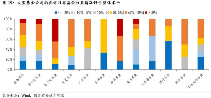 券商和基金公司的核心优势在于专业的投资管理能力,预计风险偏好较高的居民将选择券商和基金公司配置个人养老金账户。我们预计,风险偏好较高的个人养老金账户投资者将优先选择投研管理能力领先的基金和证券公司进行资产配置。截至2022年4月30日,市场上养老目标基金数量共计190只,基金规模1227亿元,整体业绩表现较好。在目前股票市场行情处于底部的情况下,市场上仍有56%的养老目标基金的收益率保持成立以来正收益,其中成立以来年化收益率在0%-5%的基金共45支,收益率在5%-10%的基金共45支,收益超过10%的基金共15支;另有84支基金成立以来收益率低于0%。其中,大型基金公司的养老目标基金收益情况好于整体水平。前十大基金公司的养老目标基金成立至今的年化收益率为正的基金占比达61%,高于整体基金56%的占比。
